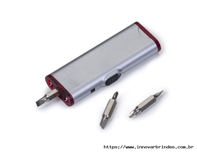 Kit ferramentas com três chaves de pontas duplas: uma em fenda e outra em formato Phillips. Possui estojo com encaixe magnético para as ponteiras de chave e lanterna em LED com chave liga/desliga.
